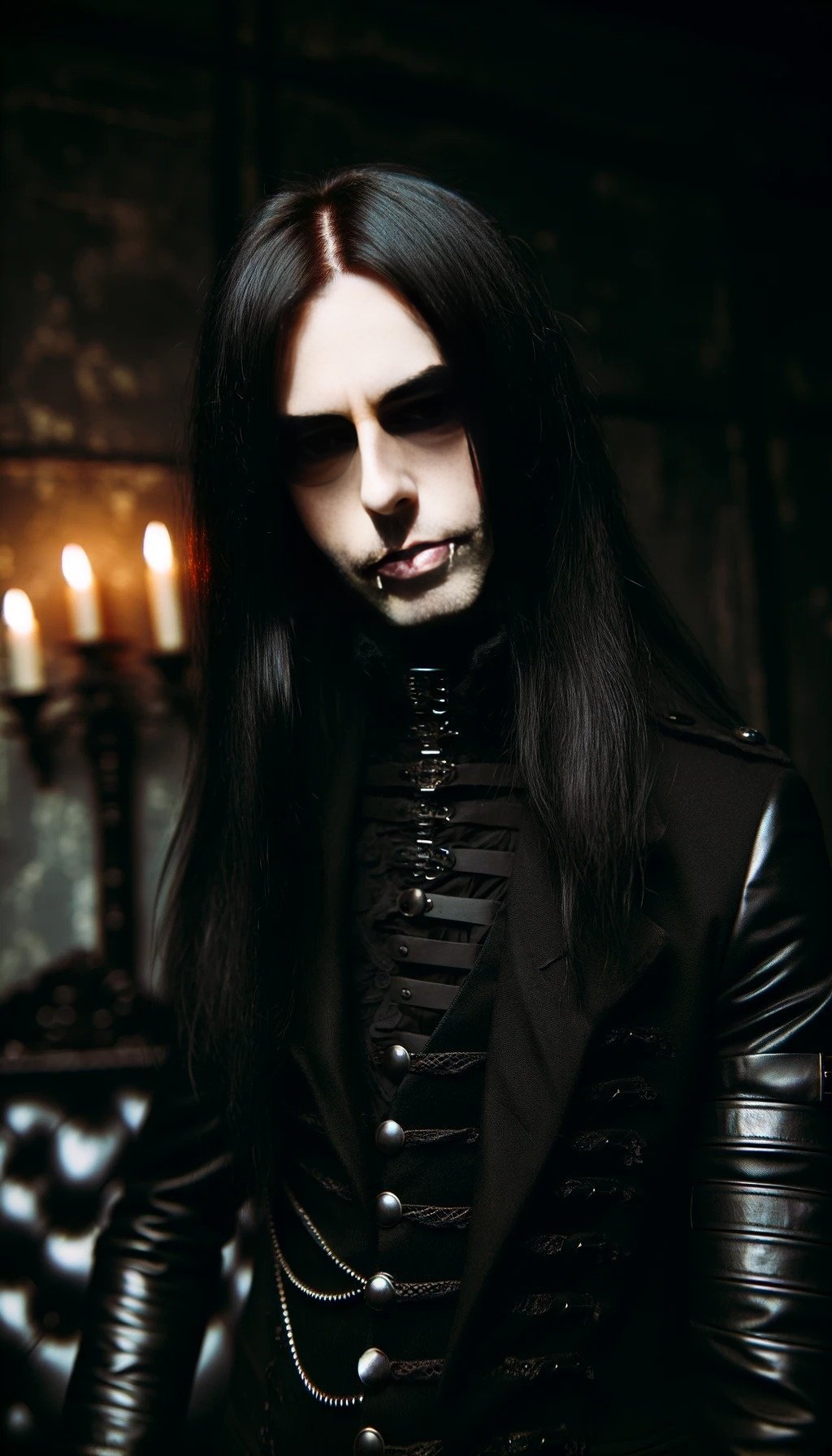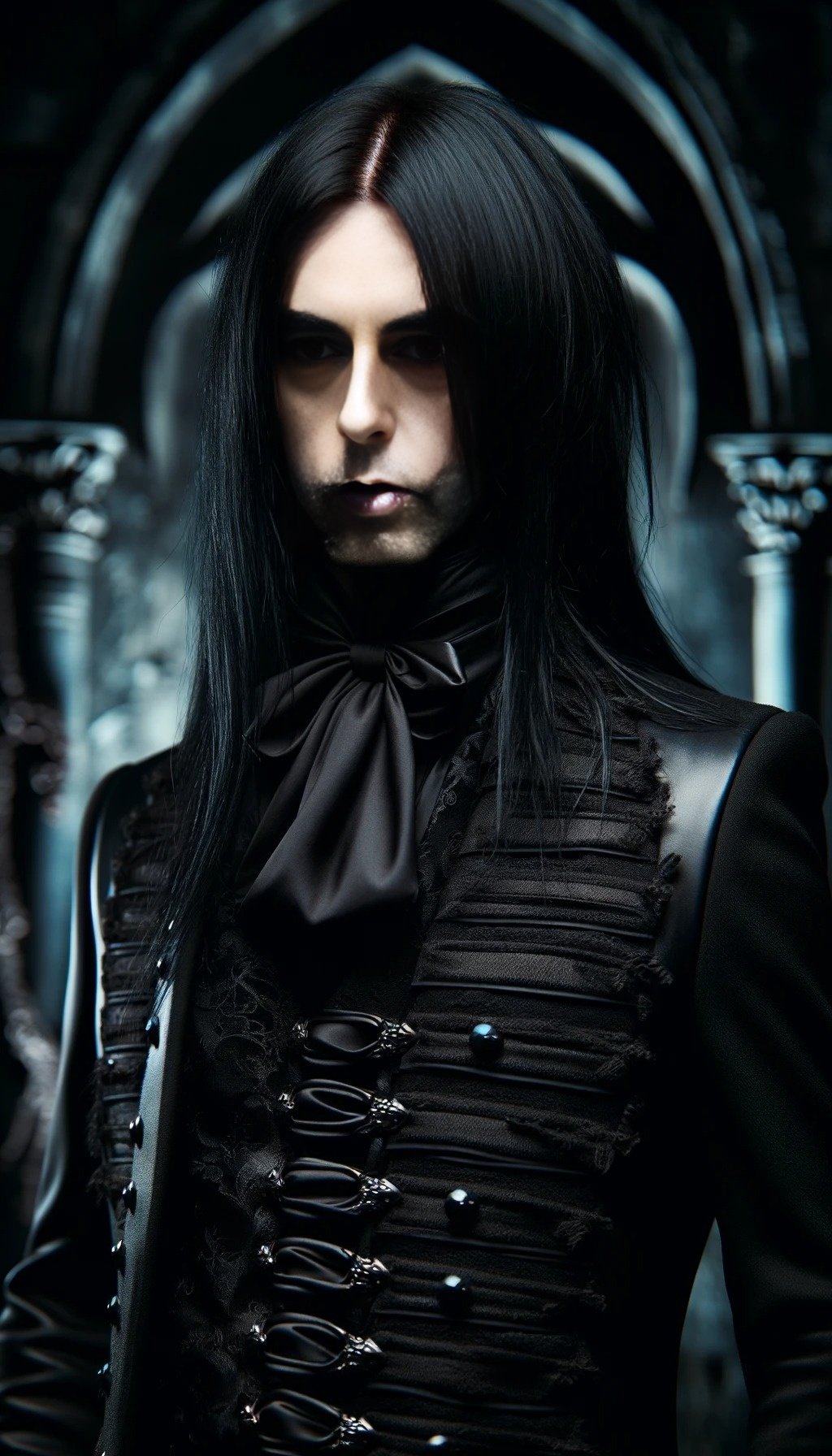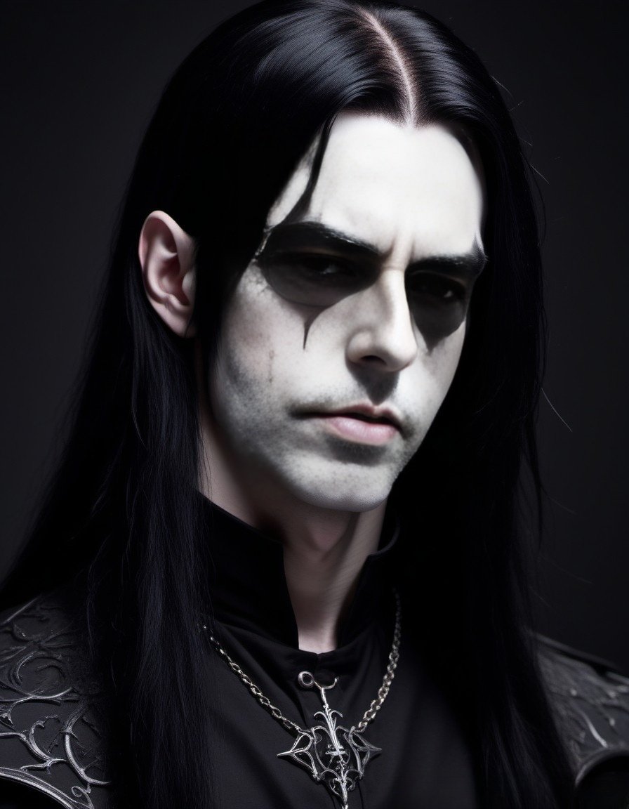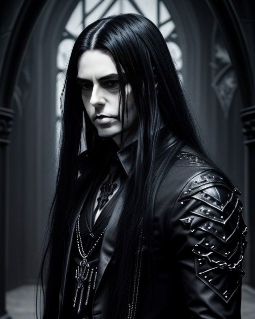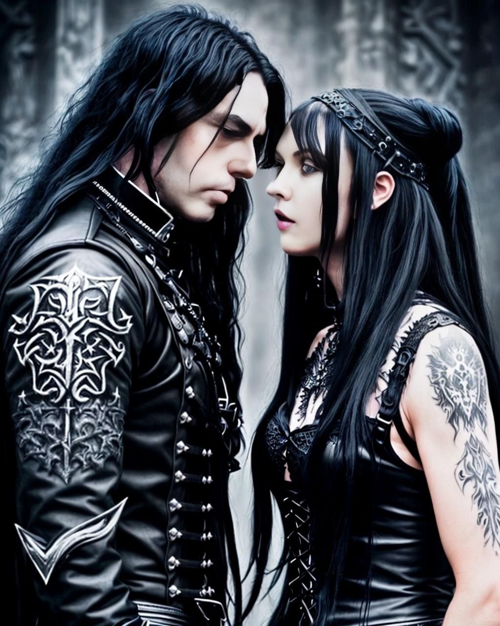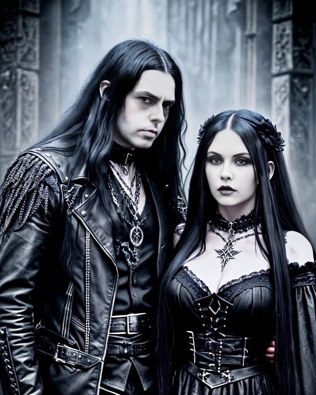 This is a story about a gothic vampire couple: The night was cloaked in a dense fog, shrouding the ancient city in mystery and silence. The cobblestone streets echoed with the distant toll of a church bell, announcing the midnight hour. Lucian, a figure draped in shadows, moved silently through the mist. His long, ebony hair flowed like ink against his pale skin, and his eyes, a piercing shade of obsidian, glimmered with an eternal hunger. His presence was magnetic, drawing the eyes of anyone who dared to glance his way, yet repelling them with an undercurrent of danger. Clad in black leather and adorned with silver chains, Lucian exuded a dark allure that was both captivating and terrifying.