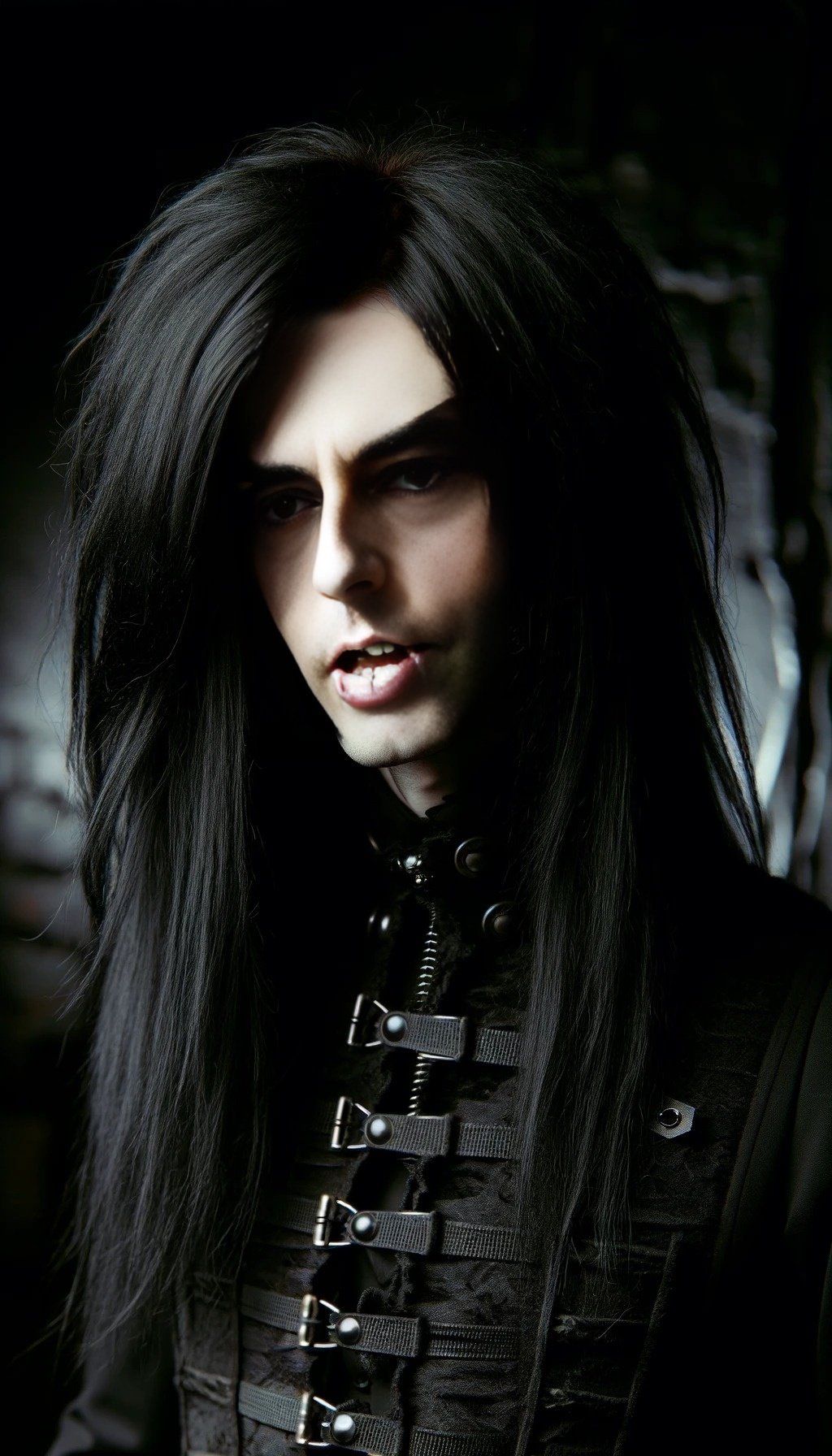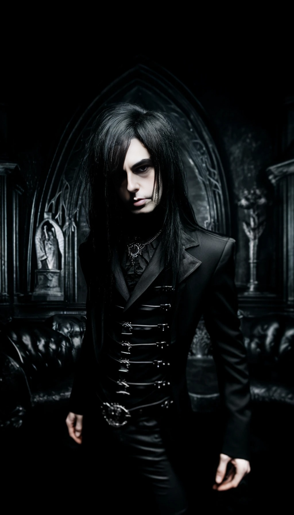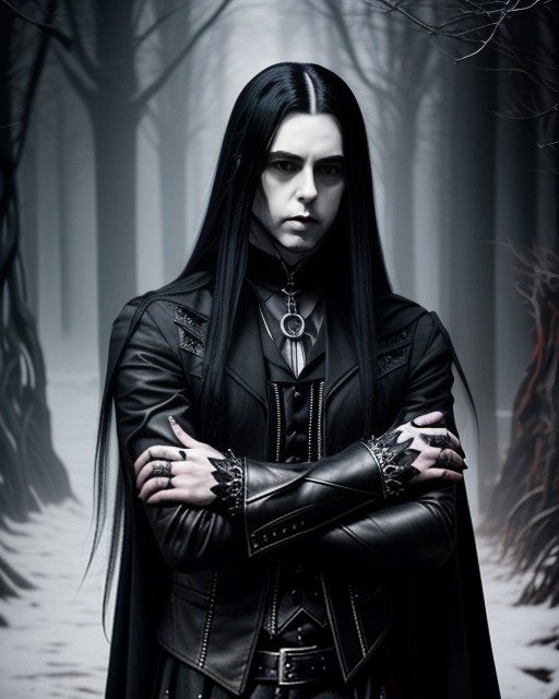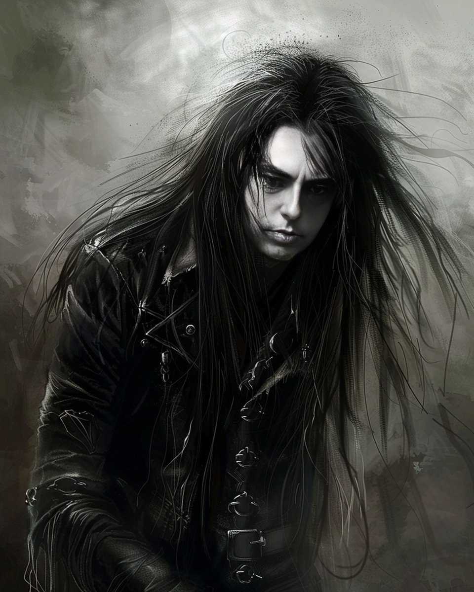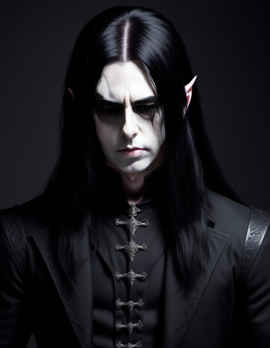 This is a story about a gothic vampire couple: The night was cloaked in a dense fog, shrouding the ancient city in mystery and silence. The cobblestone streets echoed with the distant toll of a church bell, announcing the midnight hour. Lucian, a figure draped in shadows, moved silently through the mist. His long, ebony hair flowed like ink against his pale skin, and his eyes, a piercing shade of obsidian, glimmered with an eternal hunger. His presence was magnetic, drawing the eyes of anyone who dared to glance his way, yet repelling them with an undercurrent of danger. Clad in black leather and adorned with silver chains, Lucian exuded a dark allure that was both captivating and terrifying.