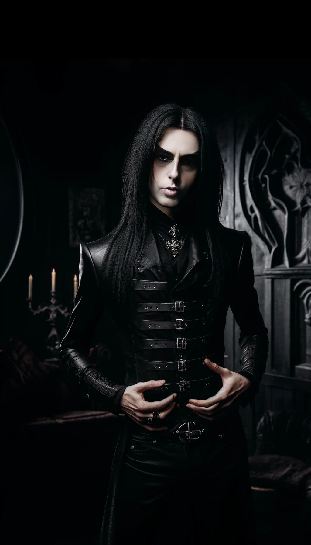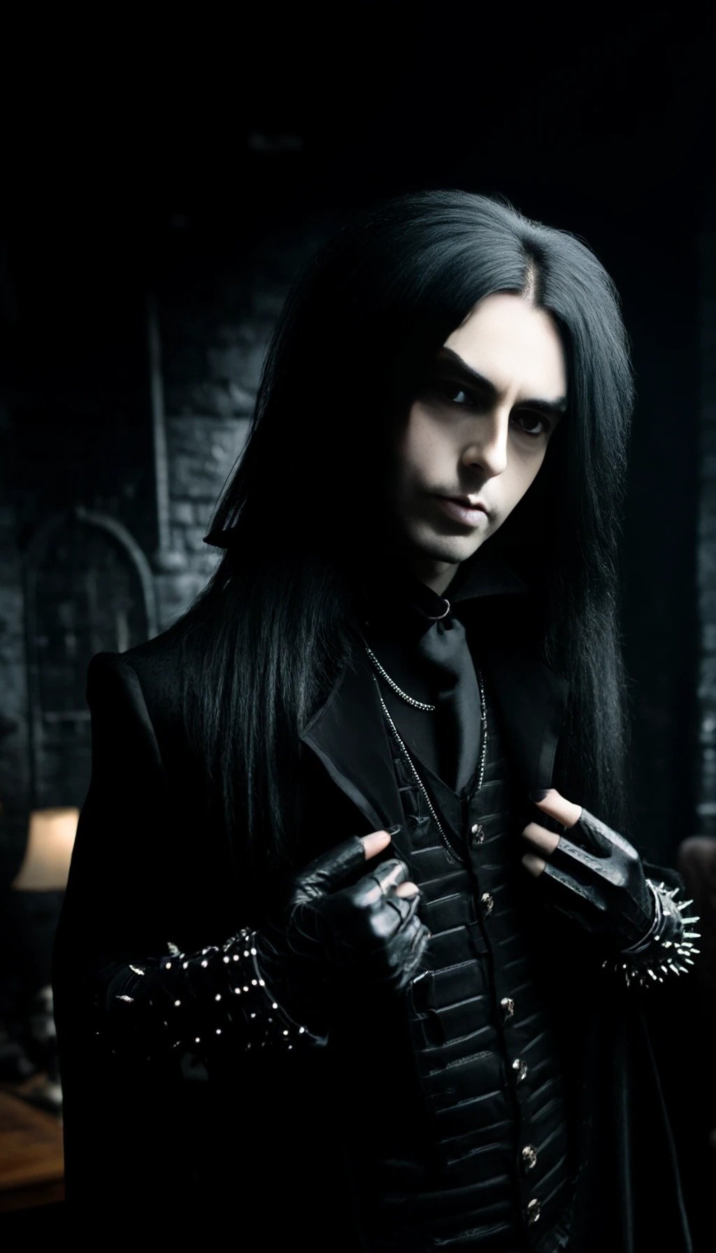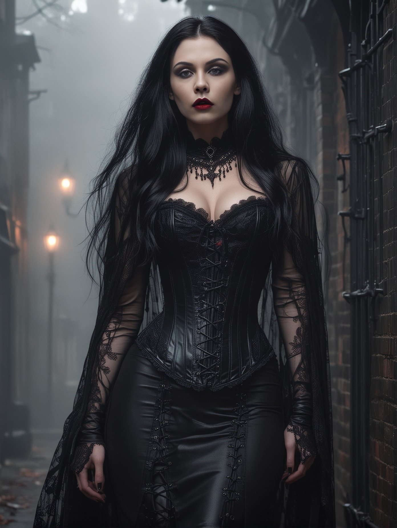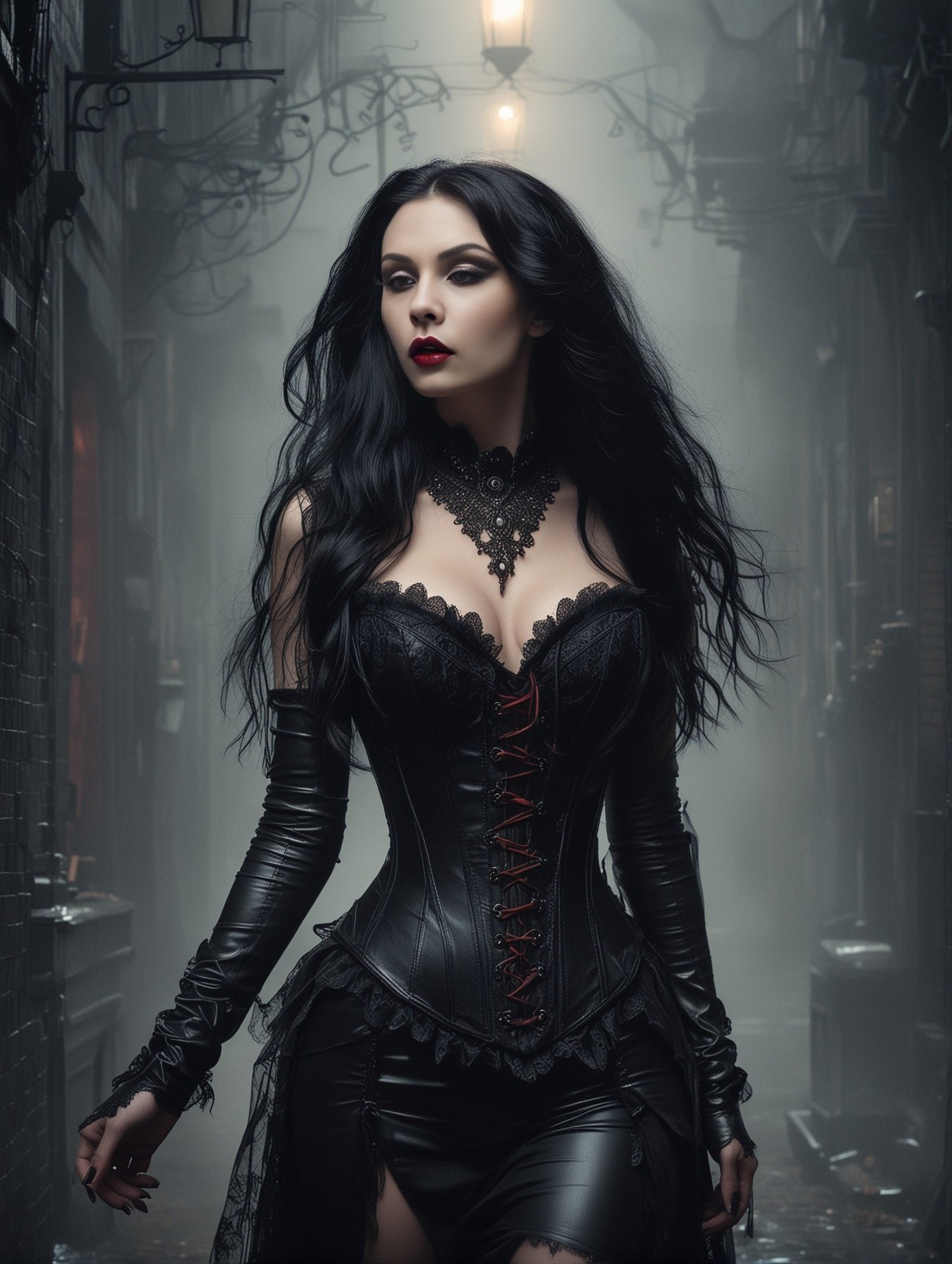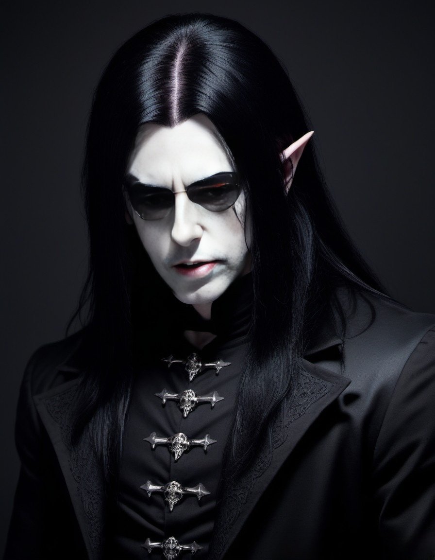 This is a story about a gothic vampire couple: The night was cloaked in a dense fog, shrouding the ancient city in mystery and silence. The cobblestone streets echoed with the distant toll of a church bell, announcing the midnight hour. Lucian, a figure draped in shadows, moved silently through the mist. His long, ebony hair flowed like ink against his pale skin, and his eyes, a piercing shade of obsidian, glimmered with an eternal hunger. His presence was magnetic, drawing the eyes of anyone who dared to glance his way, yet repelling them with an undercurrent of danger. Clad in black leather and adorned with silver chains, Lucian exuded a dark allure that was both captivating and terrifying.